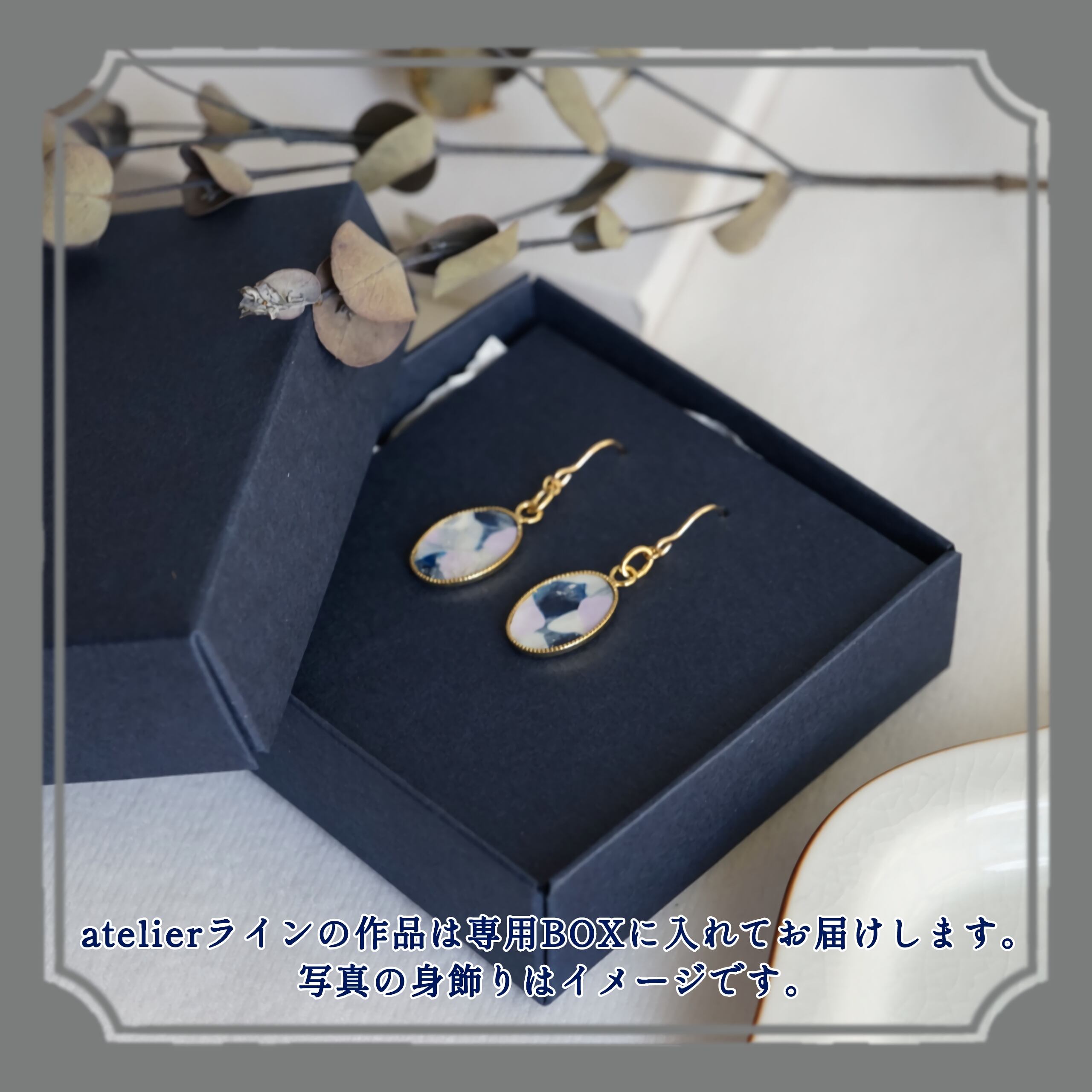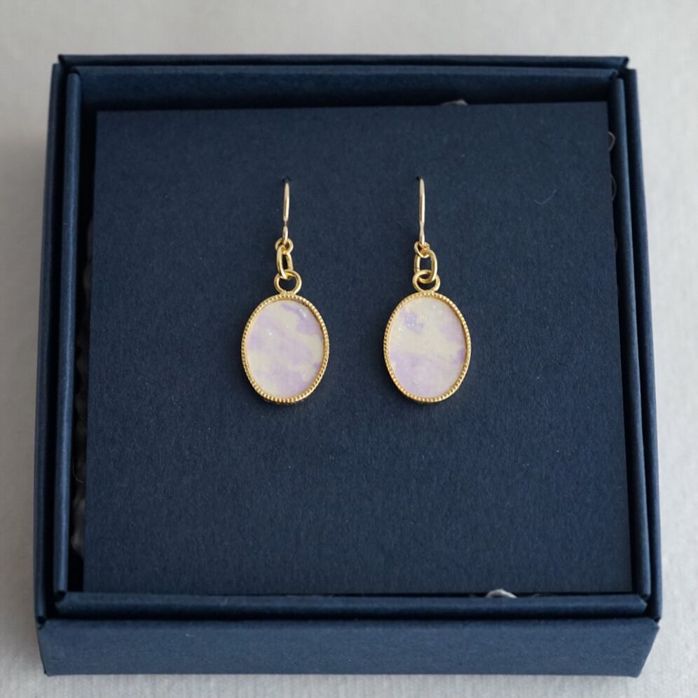 この作品は、淡いラベンダー色の翡翠を思わせる、やさしい色合いの耳飾りです。